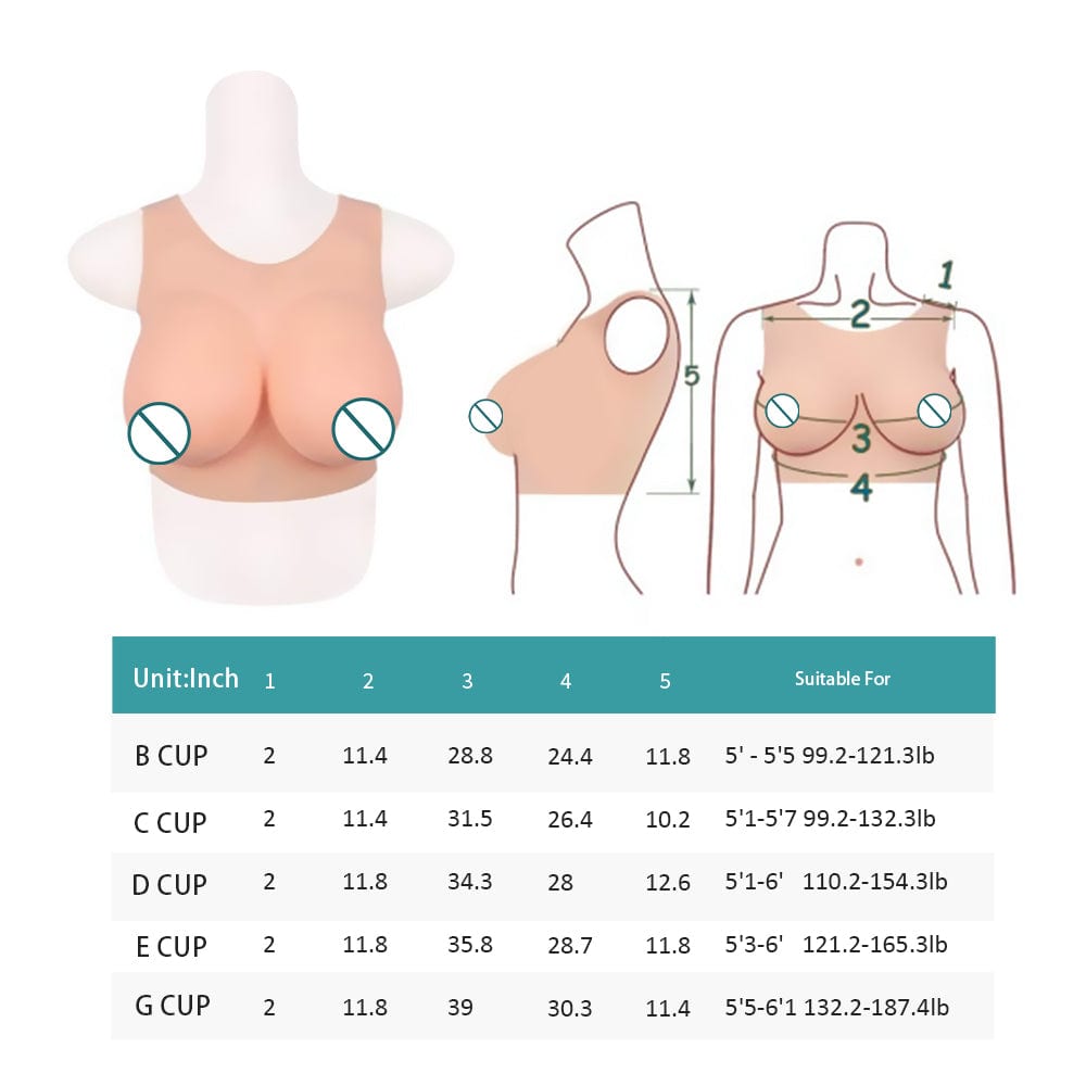 If you're looking at this listing, buy it. This is everything your cheap one isn't. 38" chest with silly-cone filled E-cup looks and feels ah-mazing! Also, the hole in the back is essential. Not only does it keep you cool, but it makes putting it on and taking it off by yourself no longer a panic-inducing ordeal.Tip #1: Talcum powder, baby powder, or corn starch. Find or acquire some. Sprinkle liberally on all interior surfaces prior to wearing and add some more down the neck and under the arms every 30-60 minutes to keep you cool, dry, and unchaffed. To maximize application convenience, pour the powder into a clean restaurant-style reusable catsup or mustard bottle. You know, the ones that are just solid red or yellow with the conical tip? (You can get them for like a dollar at a restaurant supply store, so don't steal one!) That's the secret to getting your powder exactly where you need it to go.Tip #2: Wear a bra, you slut! E-cups are large and silicone is heavy. So unless you want people to think you're elderly in that dress, you'll need a real bra with underwire (No bralettes. In fact, just throw those in your spare sewing fabric bin right now. You have no other use for them) and preferably padded straps to keep these babies at the appropriate height that one would expect them to be on a 25-year-old naturally-equipped individual.